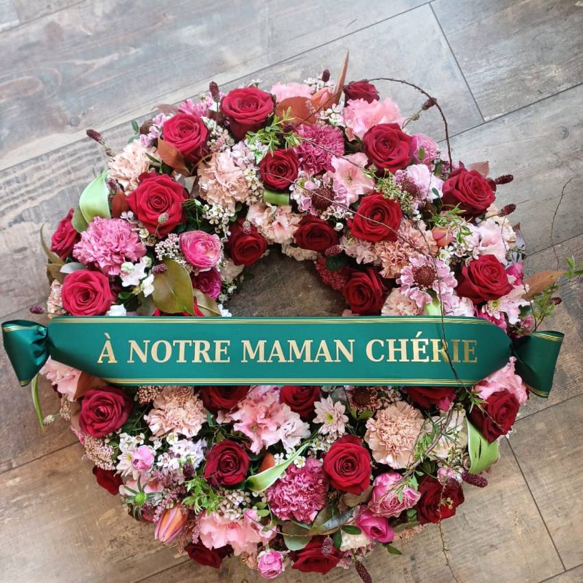 La couronne est une composition de fleurs fraiches de saison piquées dans de la mousse hydrophile biodégradable qui se conserve plusieurs jours.