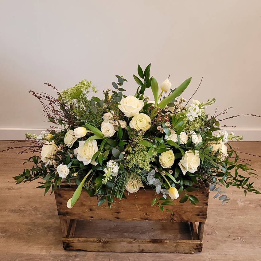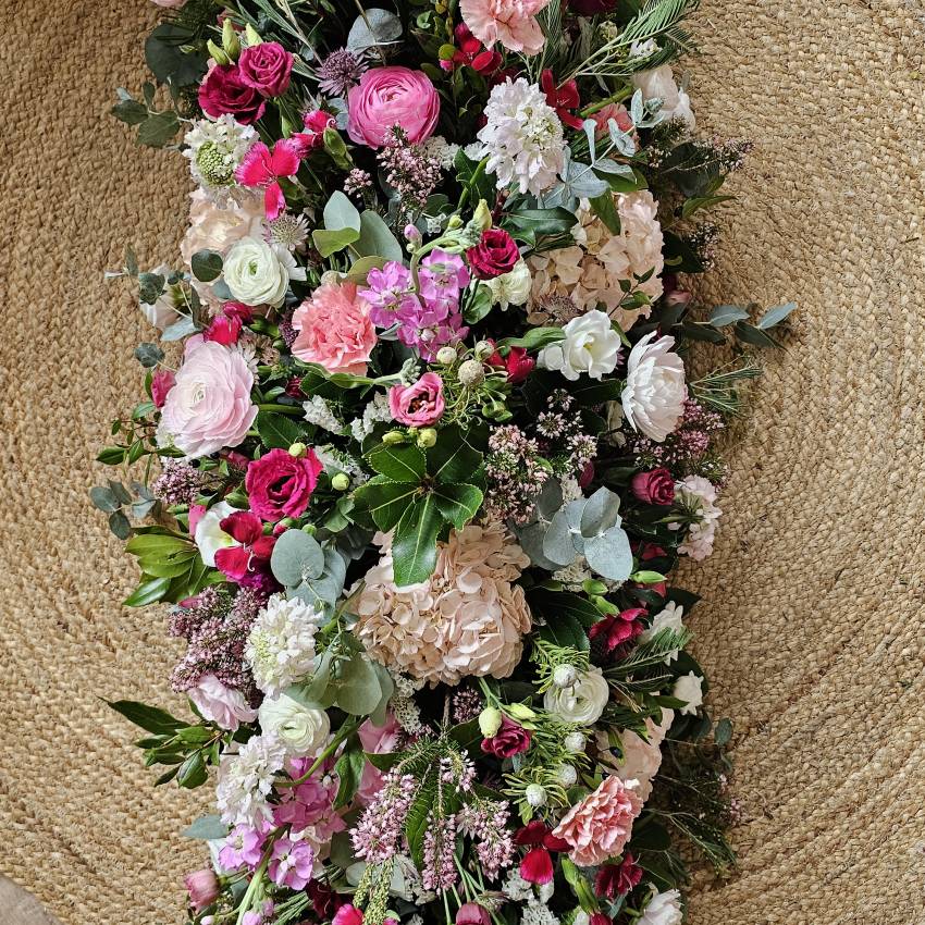 A NOTER: un dessus de cerceuil sera beaucoup plus fournis en fleurs qu'une gerbe.C'est la pièce maitresse qui acompagnera le défunt durant la cérémonie jusqu'a l'inhumation.