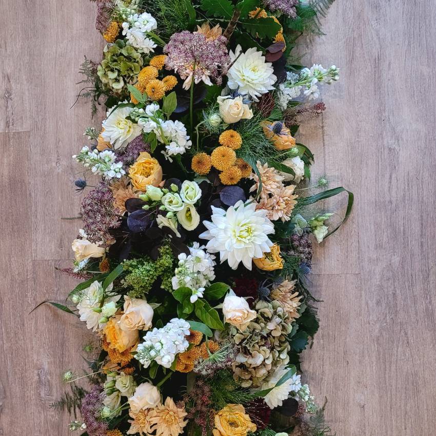 La gerbe ou dessus de cercueil est une composition de fleurs fraiches de saison piquées dans de la mousse hydrophile biodegradable qui se conserve plusieurs jours.
